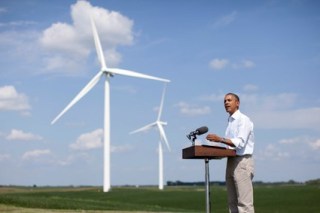 | Obama speaking in Iowa surrounded by wind turbines about extending the wind tax break. |