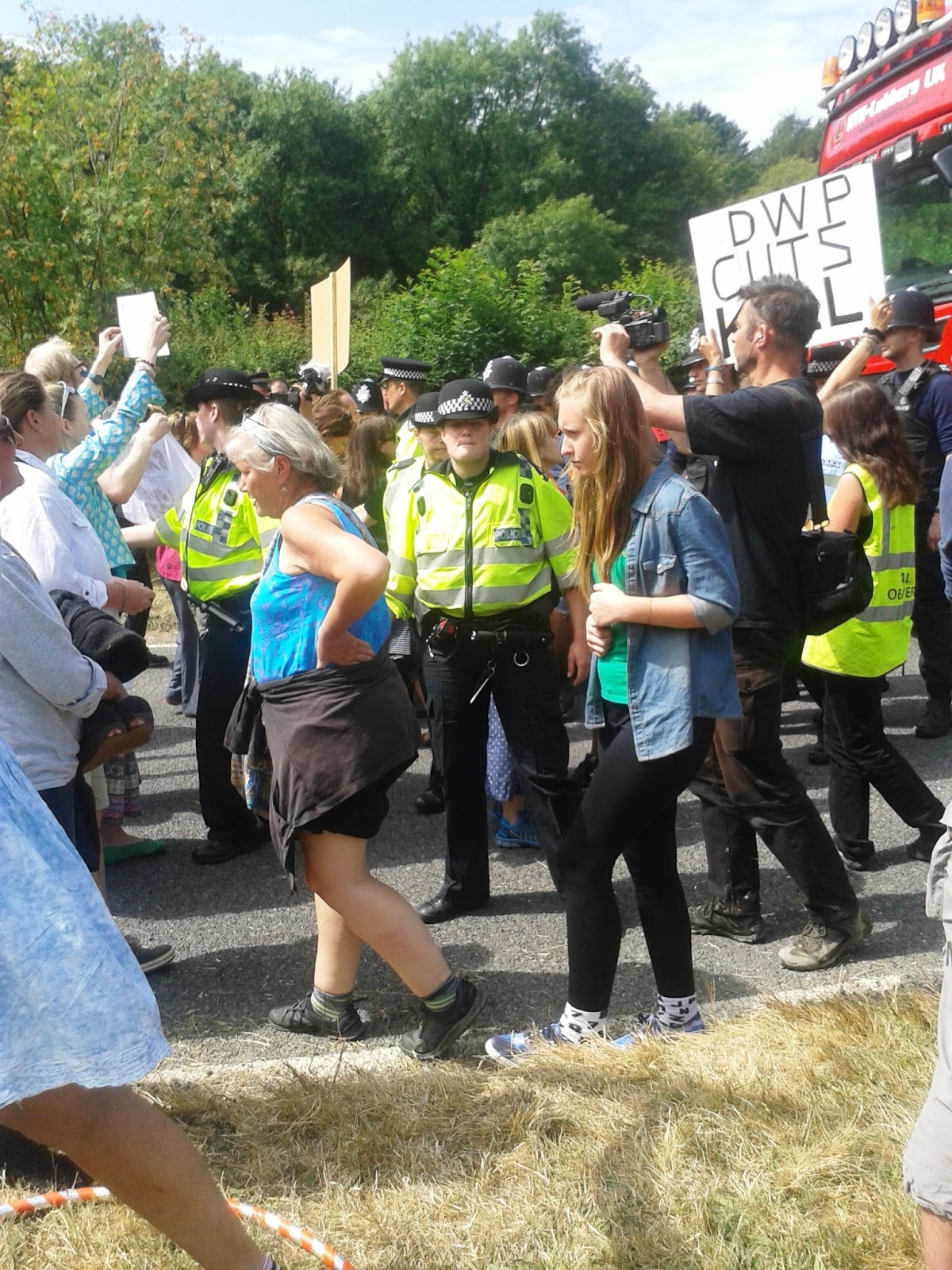 26th of July: The family friendly atmosphere that had dominated the first day ends abruptly when the Police move in heavy handed and arrests the protesters that had blocked the way and clears the way for Cuadrilla trucks to move in and out of the gate. Despite of this the protests continues but behind Police lines.