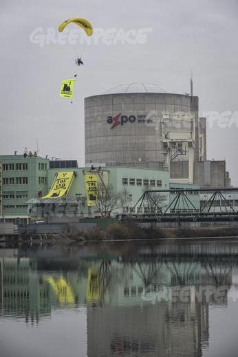 | Action underway at Beznau Nuclear Power Plant in Switzerland. Photo credit Flurin Bertschinger / Greenpeace. |