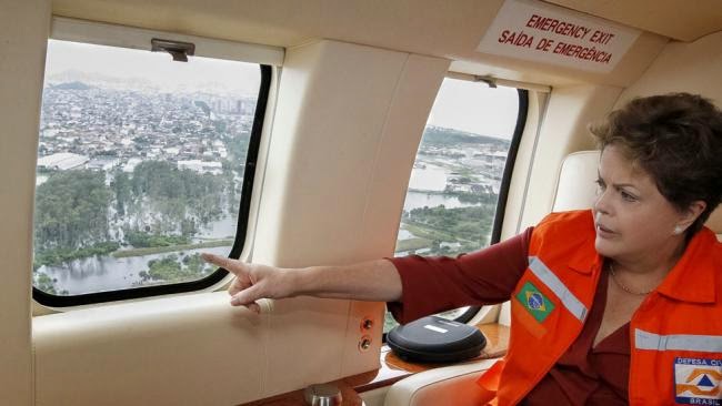 | Brazil’s President Dilma Rousseff inspects flood hit areas during a flood in December last year. Photo credit: AP / Roberto Stuckert. |