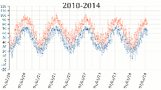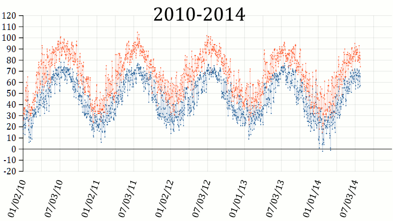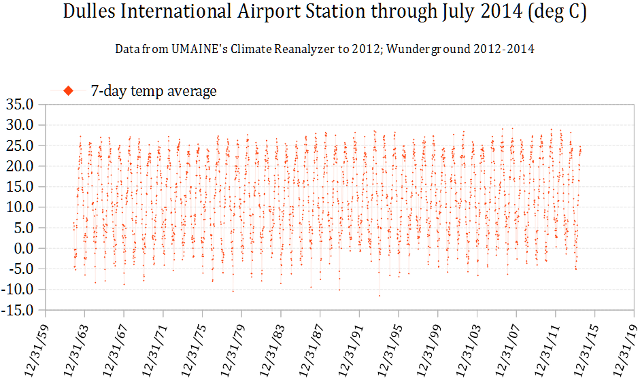 The animation above compares the daily low and high temperature record for the Washington Dulles temperature station over two different five year periods. The graph below shows daily mean temperatures, compressed into 7 day averages.