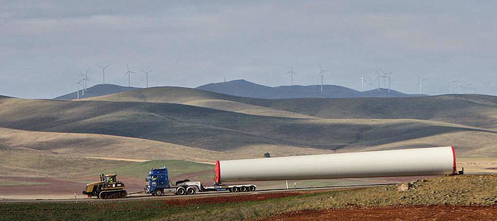 | A wind turbine part being transported in South Australia and in the background an existing wind farm. Photo credit: David Clarke via Flickr. |