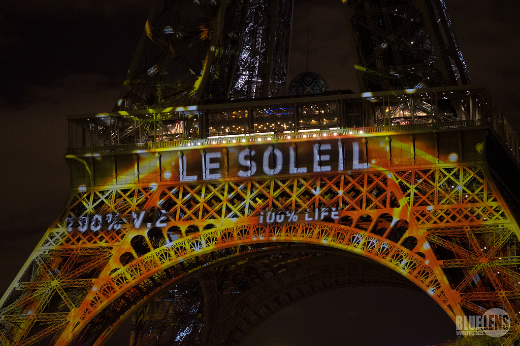 | The Eiffel Tower illuminated in a Le Soleil (The Sun) message. Photo credit: Mark Dixon via Flickr. |