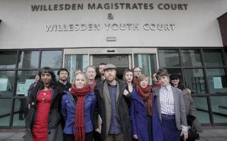 | The Heathrow 13 activists when waiting for the verdict of the trial. Photo credit: Plane Stupid. |