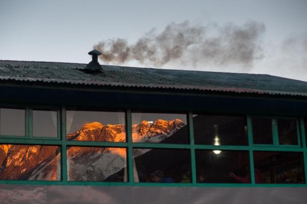 Smoke emitted from a hotel in Debuche as the sun sets over Mount Everest. Recent studies show that black carbon from such smoke is causing faster retreat of the glaciers in Himalaya Region. Photo credit: Nabin Baral.