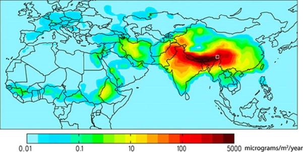 Fig I: Concentration of black carbon (micrograms/m2/year).