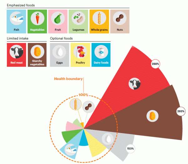 Globally, that would involve a doubling of fruit and vegetable consumption. At the same time, meat eating would more than halve, with sugar consumption shrinking by a similar amount. Not all meat is created equal, and the report leaves more room for chicken and fish than it does for red meat. Eggs are a good source of protein and included as an optional food. Most food cultures could make more room for nuts, seeds and legumes.