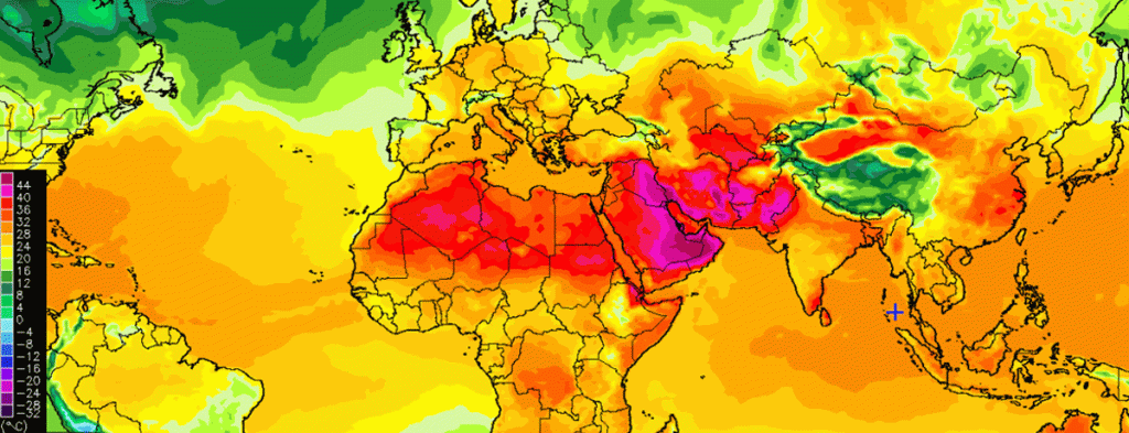 When we Brits talk about heatwaves we mean temperatures that reach as high as, you know, 34 or 35 degrees celsius. These are not temperatures that will elicit much sympathy from readers in more Equatorial regions. To put things in perspective here’s a global map of temperatures right now:
