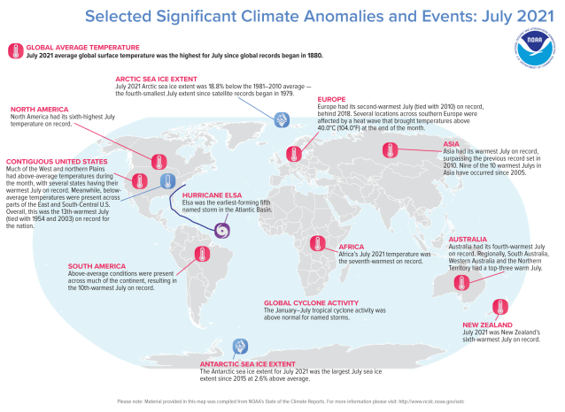 NOAA Administrator Rick Spinrad, Ph.D. said “July is typically the world’s warmest month of the year, but July 2021 outdid itself as the hottest July and month ever recorded. This new record adds to the disturbing and disruptive path that climate change has set for the globe.”