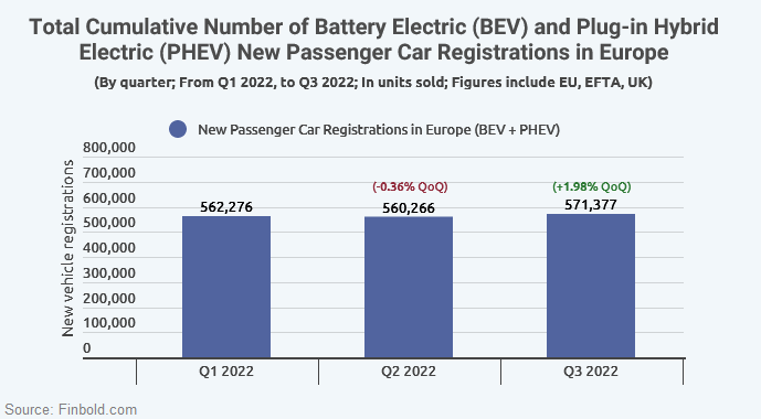 Looking at the breakdown of the car types indicates that EVs stood at 355,336 in Q3, slightly increasing from Q2’s figure of 322,144, while in the first quarter, the registration was 325,285. Elsewhere, during the third quarter of 2022, the total registered hybrids were 216,041, a drop from Q2’s 238,122. During Q1, the region had 236,991 new hybrid units.
