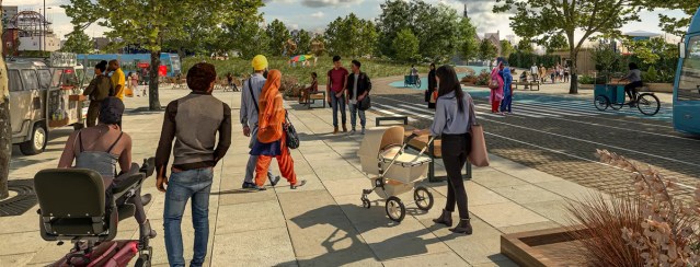 This one is the traffic-blighted environs of Leeds United’s Elland Road football ground. The space is transformed into a welcoming public space that would serve thousands of football fans, with an abundance of trees, street foods, parks and play spaces. Bonus points for the urban cable car.