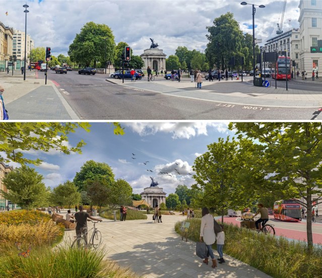 As it turns out, these sorts of visualisations can make a useful case for change. People don’t always support car-free streets in the abstract. Possible proved this in London, where 49% of residents supported the pedestrianisation of Hyde Park corner when first asked about it. A second poll showed people the picture above, and 72% supported the change.