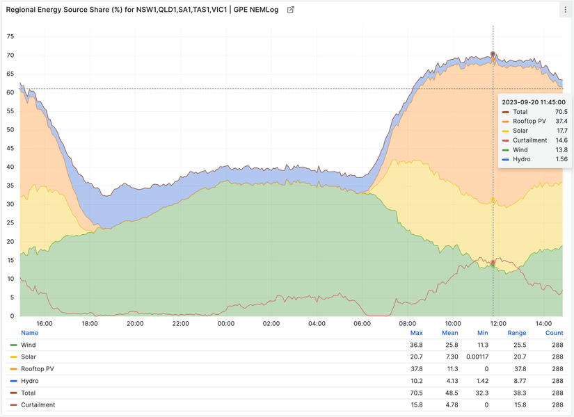 The share of renewables in Australia’s main electricity grid has reached a new high, with rooftop and grid-scale solar, wind and hydro combining to deliver more than 70% of the total underlying demand on Wednesday this week.