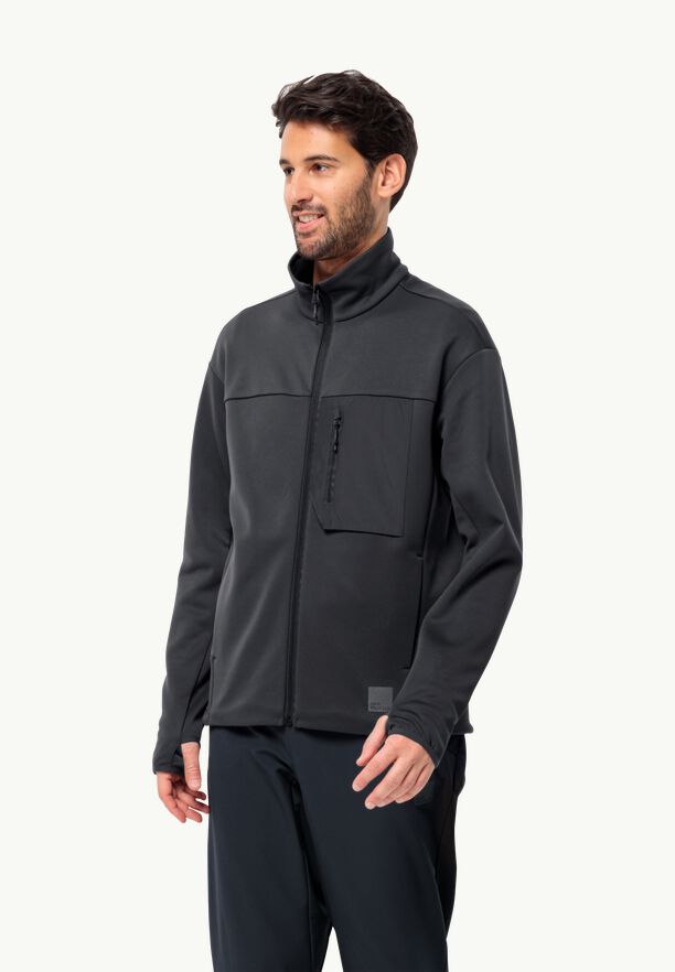 The standout features of the lightweight 430g fleece jacket which materials allow it to be stretchy and breathable is fast drying and comes with two hand pockets, zipped back-pocket, thumb holes on the sleeve cuffs.