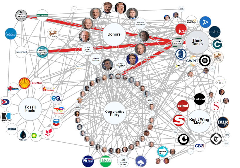 A DeSmog investigation – compiled in this interactive map – reveals the scale of this network, mapping the connections between oil, gas and coal companies, wealthy political donors, right-wing think tanks, anti-climate media outlets, and senior figures in the ruling Conservative Party.