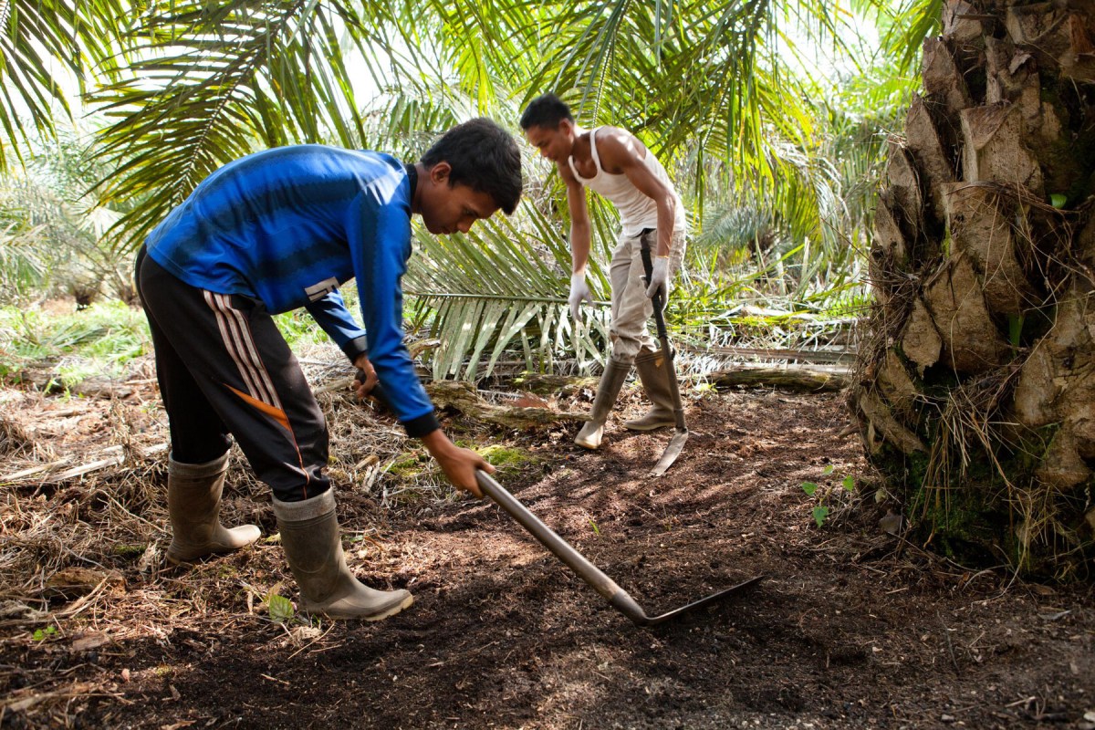The village farmers are aiming at higher yields using techniques such as manual weeding (lowering pesticide use) and pruning excess fronds. Oil palm plantations have expanded rapidly over the past two decades in Indonesia, clearing large swathes of natural forest and critical peatland areas. Promises of economic development and jobs to local communities have not come true for many. An innovative, independent small-holder approach has delivered social and economic benefits and helped protect the remaining forest. The Dosan community has committed to protecting its forests and moving to improved environmental management practices that include zero burning, no herbicide use and improved water management to maintain the peatland water system. Photo credit: John Novis.